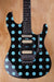 The Kramer NightSwan in black with blue polka dots is built around a double‑cutaway mahogany body and a bolt‑on 3‑piece hard‑maple neck, with an ebony fretboard that has a 16" radius, 24 medium‑jumbo frets, and pearloid “ping‑pong” inlays. The standard design includes a 24.75” scale length and a Floyd Rose Special Series double-locking tremolo with a locking nut.